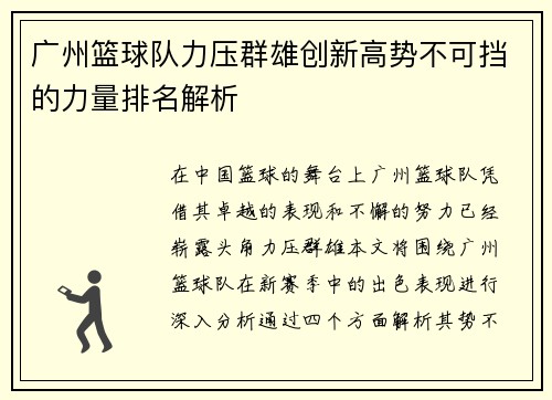 在中国篮球的舞台上,广州篮球队凭借其卓越的表现和不懈的努力,已经崭露头角,力压群雄。本文将围绕广州篮球队在新赛季中的出色表现进行深入分析,通过四个方面解析其势不可挡的力量排名。这四个方面包括球队整体实...