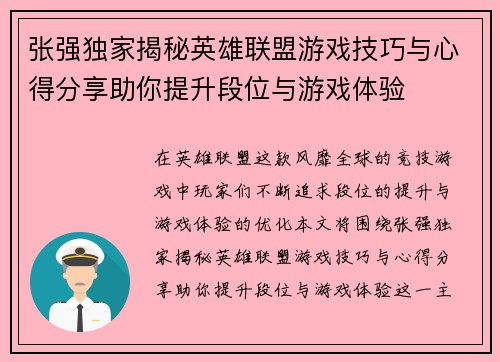 在《英雄联盟》这款风靡全球的竞技游戏中,玩家们不断追求段位的提升与游戏体验的优化。本文将围绕“张强独家揭秘英雄联盟游戏技巧与心得分享助你提升段位与游戏体验”这一主题,从多个角度为读者提供实用的建议和经...